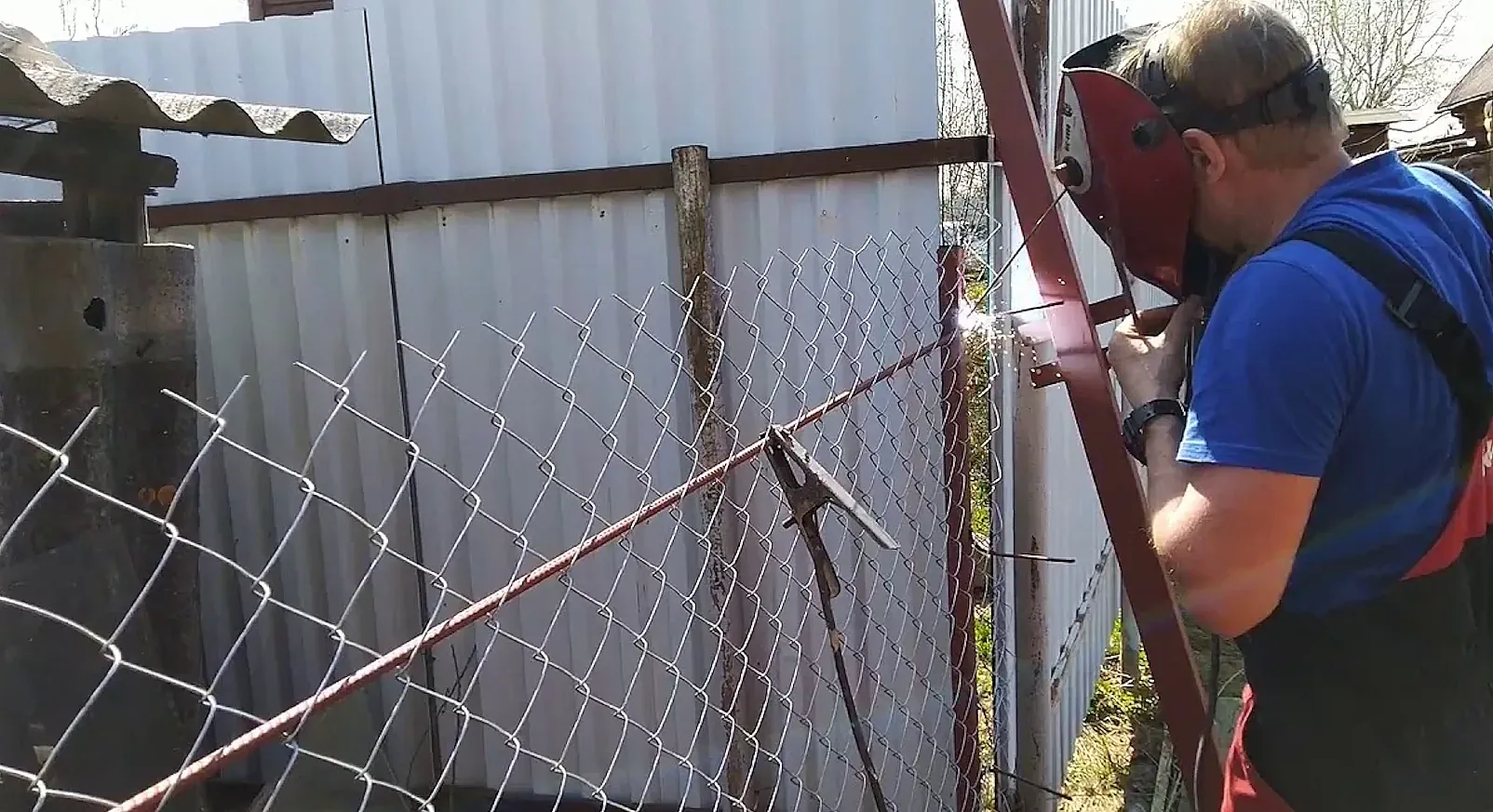 Соединять следует не на почве, так как большой вес нескольких сеток не даст вам нормально закрепить сетку к столбам, а устанавливать каждый размотанный рулон по отдельности и в таком положение их соединять. Такие работы сделать одному не реально, так как один человек должен создавать натяжку, а другой продевать соединительную проволоку. Затем когда сетку соединили, нужно с натяжкой ее смонтировать к столбам. Для этого заранее к столбам привариваются крючки крепления из кусков арматуры.